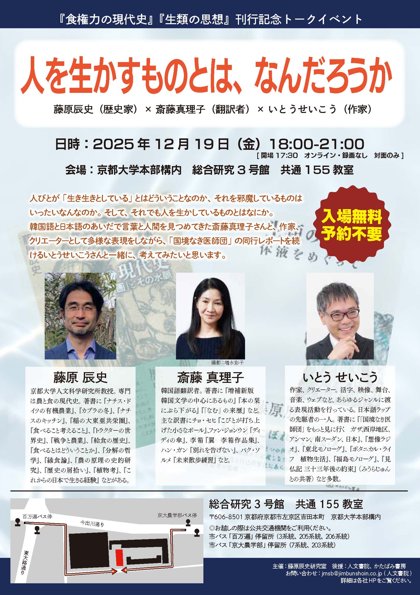 『食権力の現代史』(人文書院)と『生類の思想』の刊行を記念して、12月19日(金)18:00~21:00 藤原辰史×斎藤真理子×いとうせいこうによるトークイベント「人を生かすものとは、なんだろうか」を京都大学構内で行います。